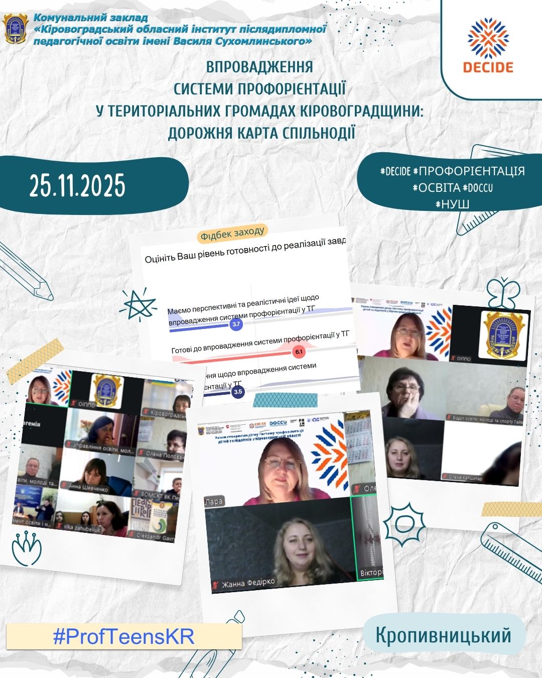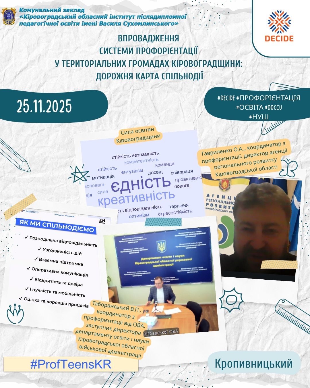 На Кіровоградщині відбулася перша регіональна організаційна сесія для керівників управлінь/відділів освіти, менторів, кар’єрних координаторів у територіальних громадах, керівників та кар’єрних радників закладів загальної середньої освіти щодо участі у Швейцарсько-українському проєкті DECIDE – «Децентралізація для розвитку демократичної освіти».