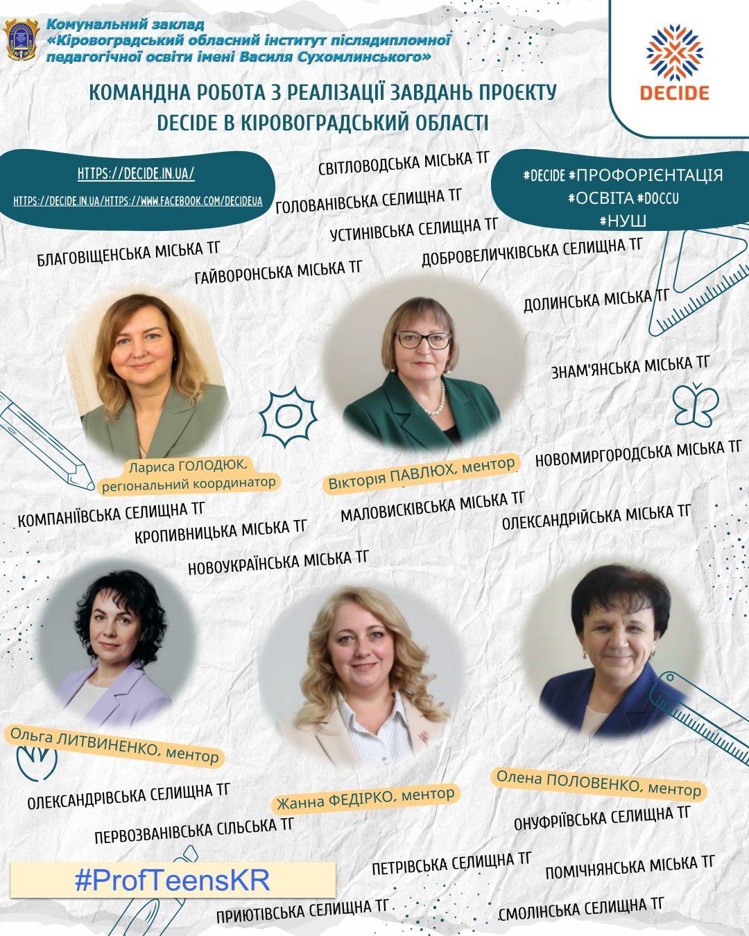 Ментори проєкту, а саме: Половенко Олена Вікторівна, завідувач обласного навчально-методичного центру освітнього менеджменту та координації методичних формувань; Федірко Жанна Володимирівна, завідувач кафедри теорії і методики середньої освіти; Литвиненко Ольга Валентинівна, завідувач навчально-методичним центром дистанційного навчання; Павлюх Вікторія Вікторівна, старший викладач кафедри педагогіки, психології та корекційної освіти, наголосили на необхідності показати учням ринок праці, навчити взаємодіяти з роботодавцями. Оскільки учні 8–9 класів — це саме та молодь, якій вже завтра потрібно робити вибір: йти до професійного коледжу чи продовжувати навчання в академічному ліцеї. Завдання спільноти – не залишити їх наодинці з цим вибором, а дати реальні інструменти для свідомого рішення.