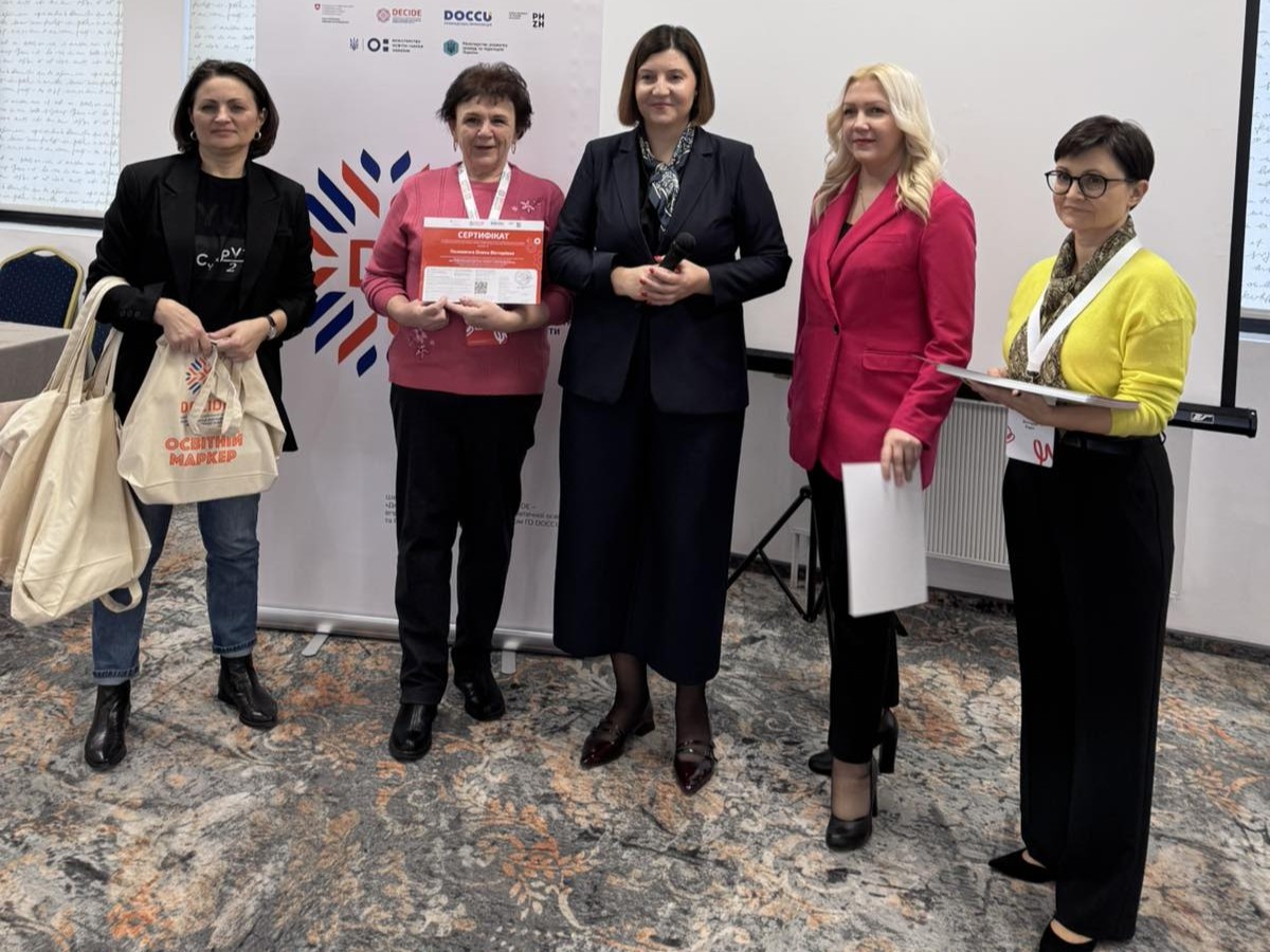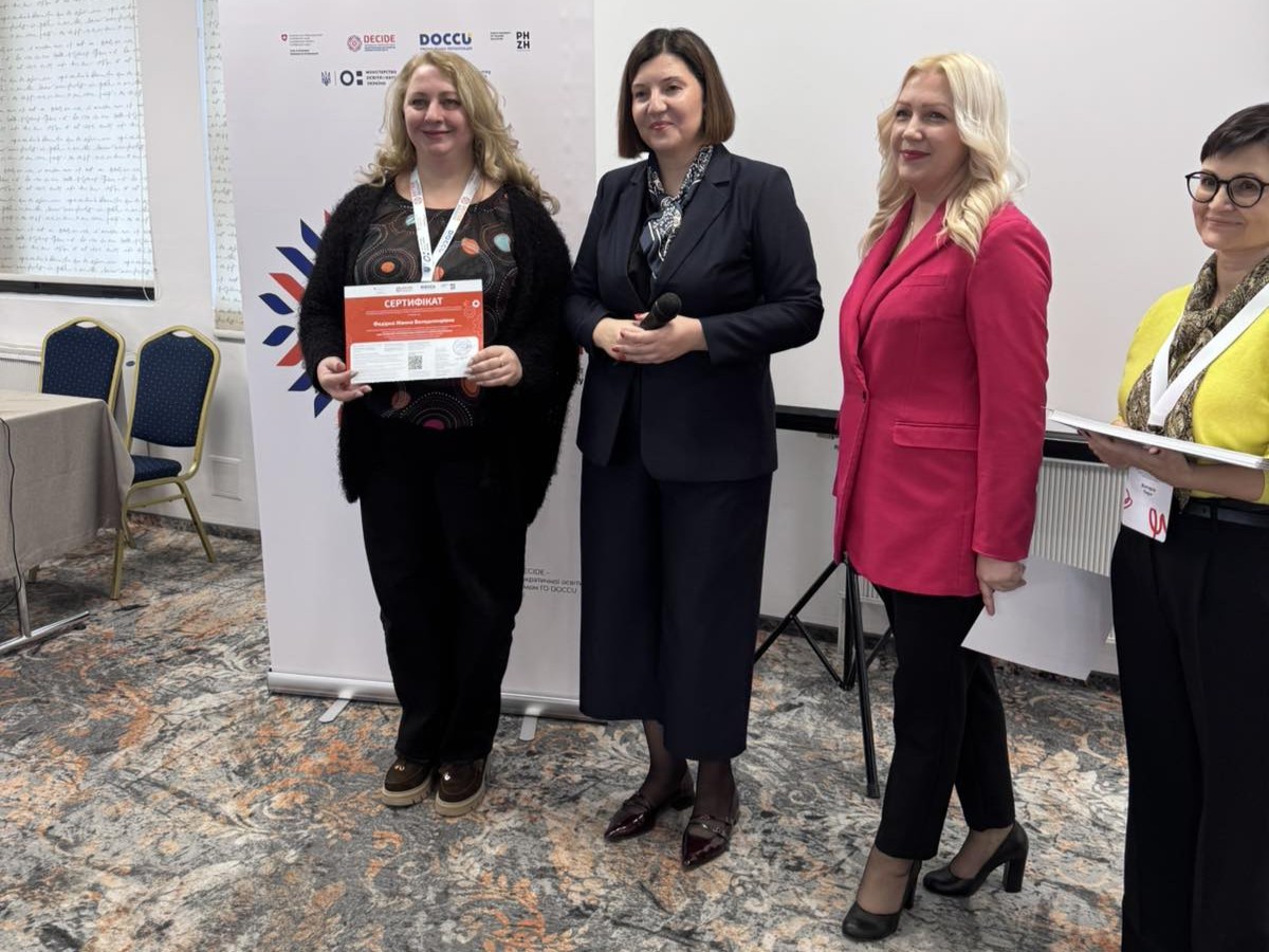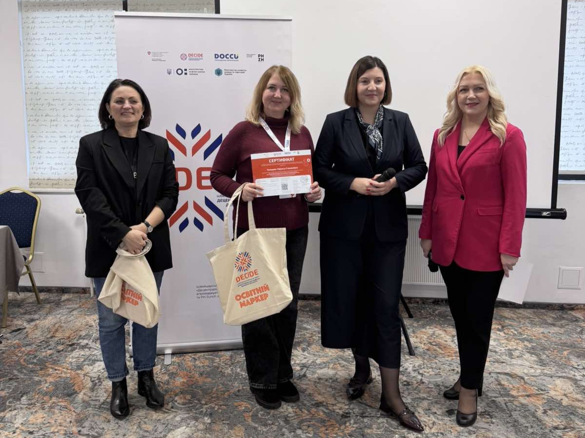 Представники комунального закладу «Кіровоградський обласний інститут післядипломної педагогічної освіти імені Василя Сухомлинського» (Лариса ГОЛОДЮК, Жанна ФЕДІРКО, Олена ПОЛОВЕНКО, Ольга ЛИТВИНЕНКО, Вікторія ПАВЛЮХ) успішно опанували програму підвищення кваліфікації «JOBS: менторство для вчителів у профорієнтаційній роботі». Навчання відбулося в межах швейцарсько-українського проєкту DECIDE «Децентралізація для розвитку демократичної освіти». Проєкт DECIDE впроваджується ГО DOCCU та PHZH International Projects in Education за підтримки Embassy of Switzerland in Ukraine / Посольство Швейцарії в Україні.